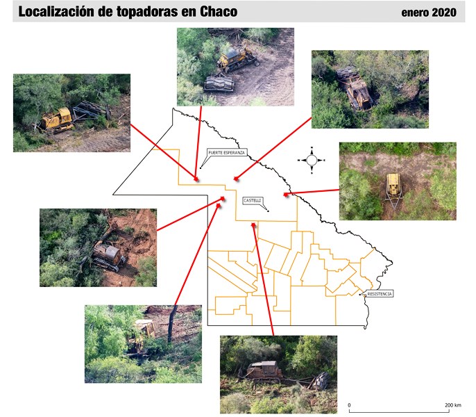 Resistencia, 3 de febrero de 2020.: Tres de los desmontes se están realizando a pocos kilómetros del Parque Nacional Copo, del Parque Provincial Loro Hablador y de la Reserva Provincial La Pirámide. Los otros tres desmontes se encuentran aproximadamente a 50, 70 y 100 kilómetros de la ciudad de Castelli, respectivamente.