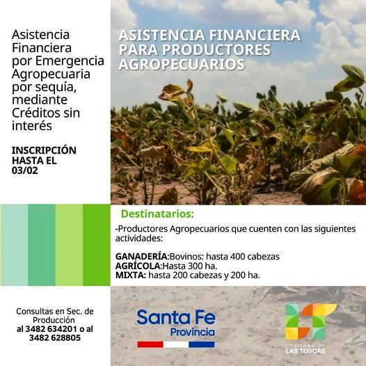 Desde el gobierno de la ciudad de Las Toscas informan sobre la asistencia financiera para los productores agropecuarios afectado por la sequía.