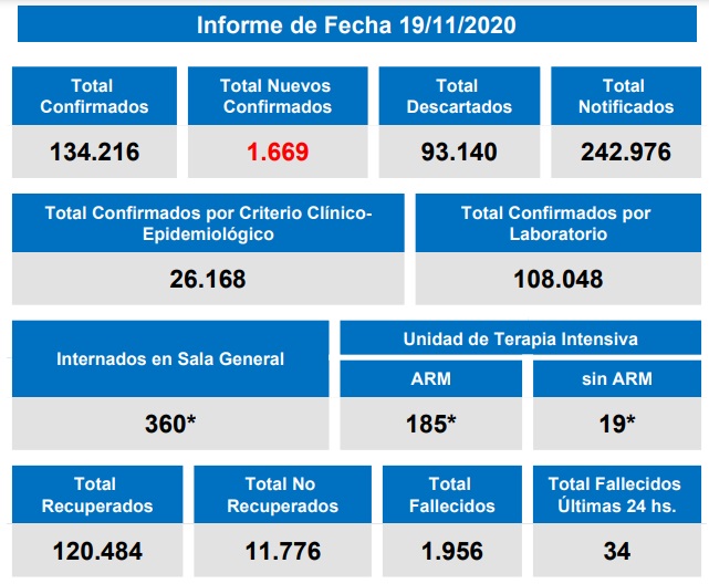 2020-11-19 19.30 hs-Parte MSSF CoronavirusCovid-19: Provincia Santa Fe informó 1.669 nuevos casos y 34 fallecidos