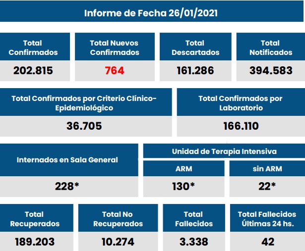 2021-01-26_Parte_MSSF_CoronavirusProvincia Santa Fe informó 764 nuevos casos y 42 fallecidos de Covid-19