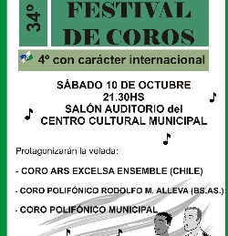 AVELLANEDA – EN EL AUDITORIO DEL CENTRO CULTURAL MUNICIPAL – Este sábado 10 de octubre en el auditorio del centro cultural municipal de la ciudad de Avellaneda se realizará el 34º Festival de coros y 4º con caracter internacional.Sinvita a las comunidades de la región a participar del 34º FESTIVAL DE COROS, 4º CON CARÁCTER INTERNACIONAL.
