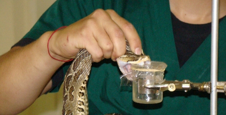 En la oportunidad se expusieron ejemplares de ofidios venenosos conservados en el serpentario de la institución. También se realizó, a modo de ejemplo, la extracción del veneno de una de las víboras.