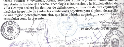 Estimamos en consecuencia que resulta decisivo que la Comisión de Análisis integrada por los ministerios de Producción, Gobierno y Reforma del Estado, Obras Públicas y Viviendas, Aguas, Servicios Públicos y Medio Ambiente, la Secretaría de Estado de Ciencia, Tecnología e Innovación y la Municipalidad de Villa Ocampo acelere los tiempos de definiciones, en función de esta coyuntura histórica irrepetible de sentar las condiciones objetivas para el pleno desarrollo de una región potencialmente rica, que hace décadas aguarda una oportunidad estratégica como la presente.
