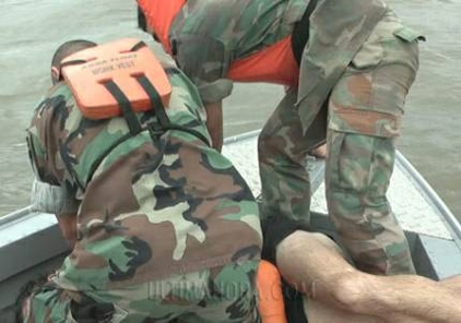 Empezamos a gritar y la lancha que estaba con una moto de agua a 20 mt de nosotros no se acerco a ayudarnos, el rio nos siguió llevando hacia la barcaza. Al cabo de 1 minuto aprox. nos encontramos en la esquina de la barcaza y el remolque (Aprox. el remolque media 15mt de largo por 70 de ancho, y 4mt sobre el nivel del rio y 2,5 mt hacia abajo.