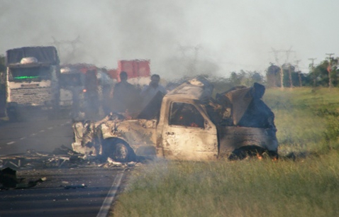 De acuerdo a los primeros indicios de los peritos que trabajaban en el lugar el conductor de la camioneta que circulaba en sentido sur norte habría intentado sobrepasar una moto al momento en que el transporte avanzaba en sentido contrario. La maniobra no salió tal cual lo calculado y la pick up impactó de lleno contra el camión, dando en pleno en el tanque de combustible del mismo, lo que ocasionó un incendio.