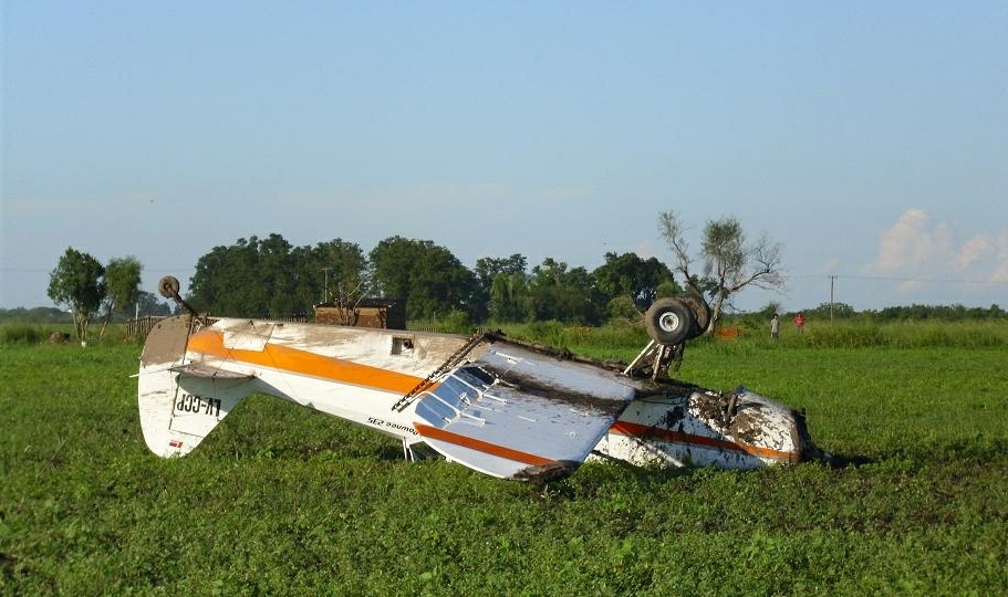 Los vecinos nos contaron que el motor de la avioneta marchaba mal y empezó a salir humo hasta que cayó en medio de un campo con mucho barro. La máquina se clavó de trompa y dio vuelta. Quedó en posición invertida y se arrastró unos 50 metros.