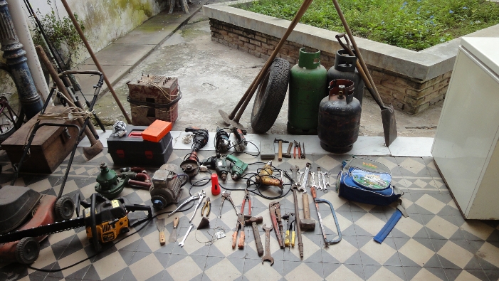 (02) remachadora – (01) máquina soldadora – (01) Freezer – (01) Motor trifásico – (01) garrafa de 10 kgs. – (02) garrafa de 15 kgs. – (03) amoladoras – BLACK AND DEKERS – ( 01) máquina de cortar césped – (01) Bomba Centrífuga – (03) Taladros – ( 01) Motosierra – (01) Bicicleta Todo Terreno – (02) bicicleta playera – (01) linterna – (01) horquilla de jardín – (01) hacha; (01) rueda completa marca FATE – (01) plancha de madera – (02) caja de pesca – (03) tramos de caños plástico – (02) caña de pescar (01) trozo de hierro – Gran cantidad de Herramientas varias ( martillos – llaves de boca – llaves tubo pinzas – martillos – etc).
