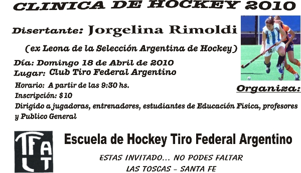 Al día siguiente, o sea el próximo domingo 18, estará visitando al club Jorgelina Rimoldi, ex Leona de la selección Argentina de Hockey y actual jugadora del club San Andrés de Buenos Aires, donde estará desarrollando una clínica de Hockey teórico-practico, organizado por la Subcomisión de hockey de Tiro Federal.
