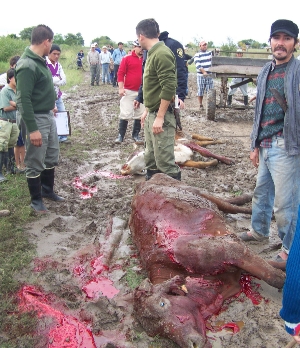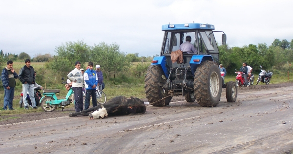 Justo 1 km antes de llegar al acceso de pavimento de San Antonio de Obligado, en un cruce de calle rural, los peones del Sr. Delfabro Rodolfo, hacían cruzar unos 100 vacunos de este a oeste, es decir, del pueblo hacia la zona rural, cortando la ruta Nº 11 y en ese preciso momento, el camión Volvo no pudo detener la marcha, lo que termínó por impactar en 12 animales vacunos grandes, siendo muertos en el acto 9 de ellos y los otros 3 hubo que sacrificarlo por las quebraduras que tenían.