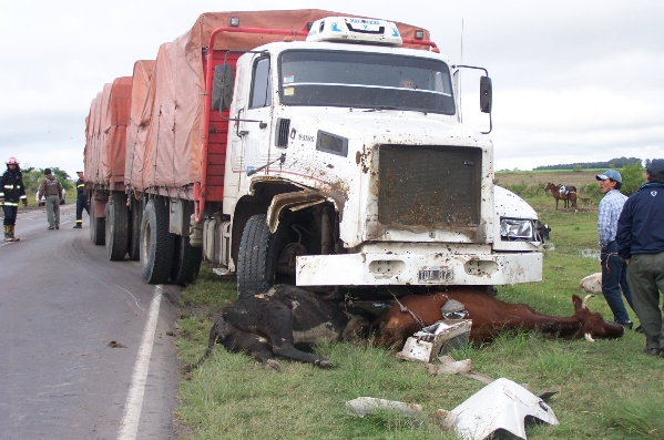 ENTRE SAN ANTONIO Y TACUARENDÍ – Fue 1 km antes de llegar al ingreso a la localidad de San Antonio de Obligado, cuando una tropa de animales cruzaba la ruta 11, un camión impacto sobre 12 vacunos, ocasionando la muerte de ellos.Carlos Agustín Gómez es el chofer del camión Volvo 340 power, con patente Nº TQA 873, quién se dirigía de Buenos Aires a Resistencia llevando una carga, que según él, eran productos para el hogar.