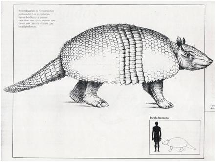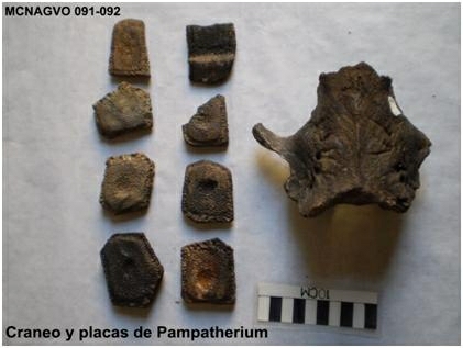 Se trata de un cráneo y 8 placas pertenecientes a un Pampatherium, sólo se encontró la parte posterior del cráneo, la parte palatal se perdió, pero éste conserva rasgos del animal que lo hace identificable; dos (2) placas que corresponden a las bandas móviles y seis (6) placas de la parte rígida de la coraza.
