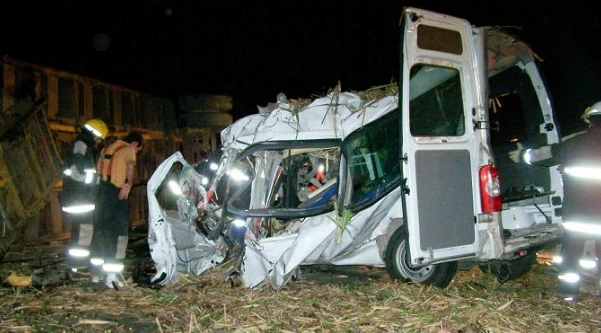 LA MAYOR TRAGEDIA EN EL NORTE SANTAFESINO – Una Traffic perteneciente a la comuna de Villa Guillermina con padres y chicos de la localiad, que volvían de participar de un ecuentro de danza en Villa Ocampo, envistió un camión Java que transportaba caña de azúcar, sobre ruta nacional 11° a la altura de la curva de Campo Mejías, en el Km. 875.Una combi de la Comuna de Villa Guillermina, excedida de pasajeros, la mayoría niños y adolescentes de una escuela de danzas folklóricas de ese pueblo, impactó de lleno contra un camión Java cargado de caña de azúcar, tirado por un viejo camión en pésimo estado y claramente fuera de la ley de tránsito, imposible de superar una revisión técnica.
