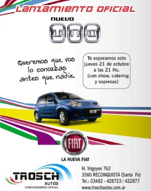 Trosch Autos presenta el nuevo Fiat Uno adminypunto hace 15 años EN RECONQUISTA – La concesionario Fiat de Eduardo Trosch, presenta este jueves el nuevo Fiat Uno. Será en su sede a las 21 horas con show, catering y sorpresas.