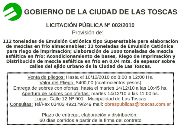 LAS TOSCAS – PENSANDO EN LA CIUDAD – llamado a licitación pública para llevar adelante el bacheo la repavimentación total de las calles 3 entre 2 y 8, 8 entre 3 y 11, 29 entre 10 y 20 y 20 entre 29 y 31, de los Barrios Itati y Virgen Niña. Pequeña reseña.El Ejecutivo municipal de la ciudad de Las Toscas, a través de la gestión del intendente Leandro Chamorro, realizó el llamado a licitación pública para llevar adelante el bacheo la repavimentación total de las calles 3 entre 2 y 8, 8 entre 3 y 11, 29 entre 10 y 20 y 20 entre 29 y 31, de los Barrios Itati y Virgen Niña.