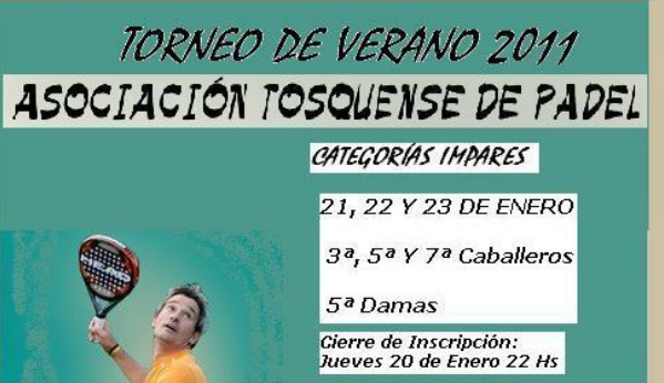 LAS TOSCAS – PADEL – La Asociación Tosquense de Padel organiza para este 21, 22 y 23 de Enero el torneo de verano 2011 para las categorías 3ª, 5ª y 7ª Caballeros y 5ª Damas.Este torneo de verano 2011, para las categorías impares, tiene el cierre de inscripción para el próximo jueves 20 de enero del cte año.