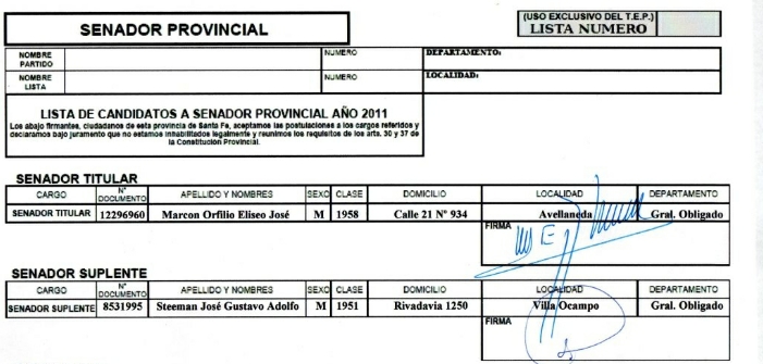 ORFILIO MARCÓN Y GUSTAVO STEEMAN – Los Candidatos a Senador titular y Suplente por el Departamento General Obligado, Orfilio Marcón y Gustavo Steeman respectivamente formalizaron sus candidaturas completando y rubricando las planillas correspondientes a dichos fines.Este lunes 14 de Febrero de 2011, los Candidatos a Senador titular y Suplente por el Departamento General Obligado, Sres. Orfilio Marcón y Gustavo Steeman respectivamente formalizaron sus candidaturas completando y rubricando las planillas correspondientes a dichos fines.