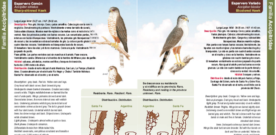 La especies se encuentran ordenadas según Familia Biologica a la que pertenecen (constando el nombre científico y el común). Para cada especie existe una lámina en color con el dibujo de la misma. La descripción comienza por los caracteres más fáciles de observar, destacándose luego los más sobresalientes. Posteriormente se describe al ave prácticamente es su totalidad. Se agrega un corte del paisaje (esquemático) en el cual se la puede encontrar con mayor frecuencia.