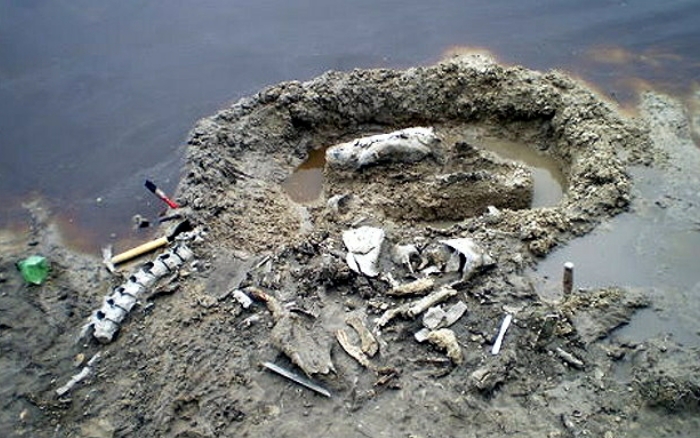 El rescatar este animal para el grupo fue un verdadero reto, ya que gran parte del animal se encontraba bajo el agua, por estar cerca del arroyo; se realizó una pequeña defensa de barro a su alrededor para luego poder vaciar el agua que cubría el material y ver realmente la dimensión; trabajando de manera segura, sin poner en riesgo los restos.