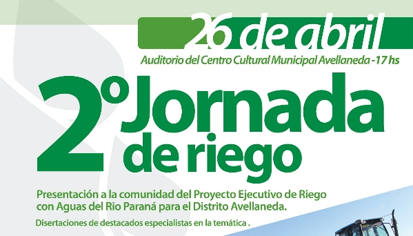 AVELLANEDA – El Martes 26 de Abril de 2011 a las 17Hs en el Auditorio del Centro Cultural Municipal, ubicado en Av. San Martín 830 de esta ciudad, se presentará el Proyecto Ejecutivo de Riego con aguas del Río Paraná para el Distrito Avellaneda.La Municipalidad de Avellaneda a través de la Secretaría de la Producción junto a la Asociación Civil Impulsar Avellaneda hacen saber a la comunidad que el Martes 26 de Abril de 2011 a las 17Hs en el Auditorio del Centro Cultural Municipal, ubicado en Av. San Martín 830 de esta ciudad, se presentará el PROYECTO EJECUTIVO DE RIEGO CON AGUAS DEL RÍO PARANÁ PARA EL DISTRITO AVELLANEDA.