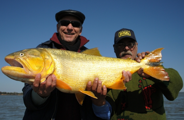 Esa fue mi sensación, durante unos 20 minutos, el mundo se detuvo, el paisaje se adormeció, hasta creo que el agua se detuvo para permitir que viviera uno de esos momentos increíbles de estar en contacto con la naturaleza, porque en ese momento era el reel tirante, el salto del gigante dorado a unos casi cien metros y la sensación de estar viviendo un amanecer encantado, un atardecer en el paraíso. El dorado que luchaba por su libertad, el hombre que peleaba por el orgullo y su debilidad de lograr el cometido encuentro. Fueron momentos de sensaciones que se las describo como lo fui sintiendo. Hasta que llegó, después de pegar algunos saltos y mostrarnos su grandeza y fortaleza, lo acerqué a la embarcación, donde nuestro guía Eduardo, nos ayudó a sacarlo.