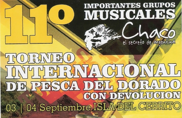 EN LA ISLA DEL CERRITO CHACO – El próximo 3 y 4 de septiembre de 2011, se llevará a cabo el 11º Torneo internacional de pesca del dorado, en la vecina localidad de la Isla del Cerrito, Chaco.Este concurso viene avanzando a pasos agigantados, motivados y auspiciados por el gobierno de la provincia del Chaco.