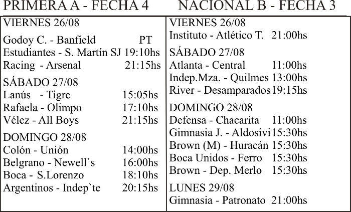 Deportes Juegan este fin de semana 26 agosto, 2011 Compartir en Facebook Compartir en Twitter tweet FUTBOL ARGENTINO – Juegan este fin de semana la 4ª fecha de la Primera división de AFA y la 3ª fecha del Nacional B.