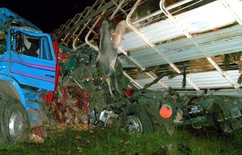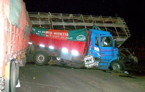 VILLA OCAMPO – Dos personas fallecidas y otras cuatro con lesiones de distinta consideración, producto de un múltiple choque en Ruta 11, intersección ruta 32, jurisdicción Villa Ocampo, en la noche del sábado. Algunos protagonistas sobrevivieron entre los hierros retorcidos. También murieron varios animales.la camioneta Toyota Hilux ingresó a Ruta Nacional 11 desde la Ruta Provincial 32 y colisionó contra el camión Ford DQH 163 con jaula en la que transportaba animales rumbo al Sur y producto del choque éste se cruzó al carril contrario e impactó de frente contra el camión Scania AWF 728 que avanzaba hacia el Norte transportando papas. Finalmente el camión Iveco BIA 876 que transportaba malta rumbo a la cervecería Quilmes de Corrientes, sufrió un impacto en el acoplado producido por la jaula cargada de animales, tirada por el Ford.