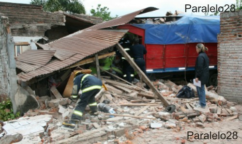 EN SAN ANTONIO DE OBLIGADO – En horas de la siesta de este martes, en una de las curvas de la ruta 11 sobre la localidad de San Antonio de Obligado, un camión terminó su recorrido incrustado en una vivienda ubicada a la vera de la ruta.Todo sucedió imprevistamente, cuando en plena curva de la ruta nacional 11, sobre San Antonio de Obligado, un camión Mercedes Benz con acoplado, desvía su recorrido, atraviesa el carril contrario, baja a la banquina, y termina chocando la vivienda en su parte trasera, sin que el pesado camión haya volcado.