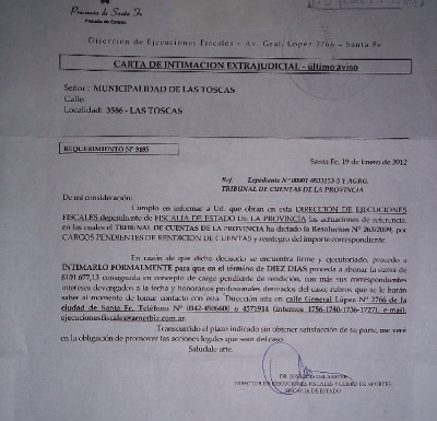 LAS TOSCAS – La Municipalidad de Las Toscas, recibió una intimación de parte de la Dirección de Ejecuciones Fiscales, dependiente de la Fiscalía de Estado de la provincia, por la suma de 100 mil pesos, por falta de rendición de la gestión anterior.La carta de intimación en cuestión dice lo siguiente: