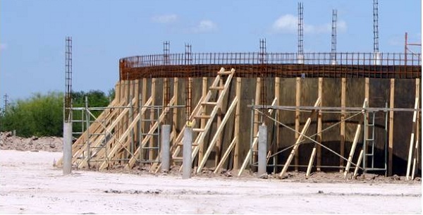 Hoy se están ejecutando las columnas y vigas de hormigón complementarias al tanque central. La inversión que supera los 2,5 millones de pesos; permitirá dotar de red cloacal al 100% de la ciudad.