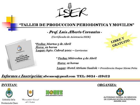 CHACO Y CORRIENTES – ORGANIZA ISER Y AFSCA – El 3 y 4 de abril se llevarán a cabo los talleres destinados a comunicadores de Chaco y Corrientes, dictado por Luis Alberto Cervantes, docente del Instituto Superior de Enseñanza Radiofónica (I.S.E.R.), Coordinador de la Carrera de Productor y Director para Radio y Televisión y organizado por la Autoridad Federal de Servicios de Comunicación Audiovisual región NEA (AFSCA NEA).Las jornadas, que se realizarán 3 y 4 de abril, serán libres y gratuitas y realizarán en diversas localidades para asegurar de esta manera el acceso de los profesionales que deseen asistir.
