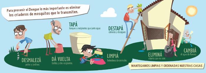 – Continuar con las medidas de descacharrización para eliminar los criaderos de mosquitos: tirar los objetos que no se usen y que puedan acumular agua; y colocar boca abajo los recipientes que se utilizan diariamente como baldes, palanganas, latas, frascos o botellas”.