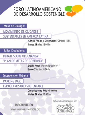 ROSARIO – Los días 23 y 24 de baril se desarrollará el Foro Latinoamericano de Desarrollo Sostenible “Rosario hacia Río + 20”, impulsado desde el proyecto Rosario Sustentable, a realizarse en la ciudad sur de la provincia. El proyecto Rosario Sustentable organizó varias actividades a realizarse en la ciudad de Rosario los días 23 y 24 de abril en el marco del Foro Latinoamericano de Desarrollo Sostenible “Rosario hacia Río + 20”.