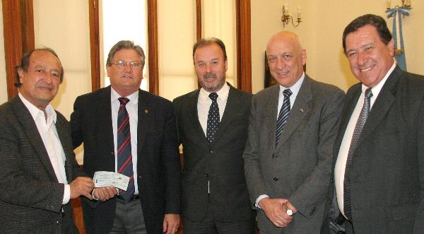 PARA LA CUENCA CAÑERA – El gobernador Antonio Bonfatti entregó esta tarde un aporte de 2,5 millones de pesos a la Asociación Civil Mesa Azucarera y de Desarrollo Regional Santafesina, para la creación de un fondo rotatorio de asistencia a pequeños y medianos productores cañeros de azúcar del departamento General Obligado.Del encuentro, llevado a cabo en el salón Protocolar de la Casa de Gobierno, en la capital provincial, participaron los intendentes de Villa Ocampo, Enrique Paduán, y de Las Toscas, Leandro Chamorro; el ministro de la Producción, Carlos Fascendini; y el presidente de la Asociación Civil Mesa Azucarera y de Desarrollo Regional Santafesina, Mario Mendiondo.