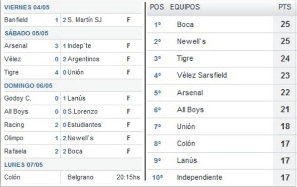 Deportes Resultados y posiciones de la 13ª Fecha 7 mayo, 2012 Compartir en Facebook Compartir en Twitter tweet NACIONALES – FUTBOL ARGENTINO –