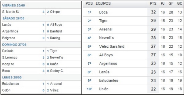 Deportes Resultados y posiciones de la 16ª fecha 29 mayo, 2012 Compartir en Facebook Compartir en Twitter tweet NACIONALES – FUTBOL ARGENTINO –