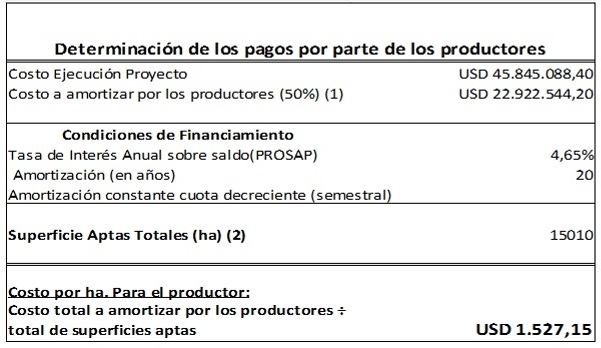 1) Productores Agropecuarios: Por la presente los productores beneficiarios de la obra estamos dispuestos a solventar el repago de hasta el 50% del valor de la obra, cuya estimación de acuerdo al proyecto ejecutivo es de dólares cuarenta y cinco millones ochocientos cuarenta y cinco mil ochenta y ocho (u$s 45.845.088).