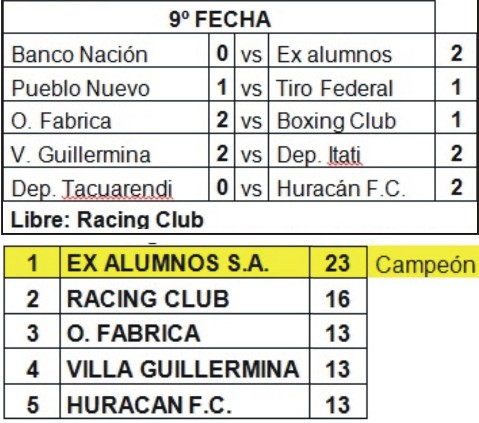 LIGA OCAMPENSE DE FUTBOL – Con el triunfo por dos goles contra cero ante Banco Nación, Ex Alumnos de San Antonio, dio la vuelta olímpica en el estadio de Huracán, cuando falta disputarse dos fechas todavía.En un partido de nivel bajo, chato, con pocas llegadas y donde la visita, no pudo desarrollar todo su futbol que habitualmente lo hace, gano con lo justo ante un aguerrido Banco Nación, que sigue pagando la falta de competencia a nivel federado, si buen es un equipo corredor, “pica piedra”, pero a la hora de definir, la falta de “olfato de gol”, se siente, pero es muy meritorio lo que hasta ahora esta haciendo este equipo.
