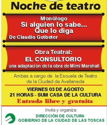 LAS TOSCAS – Este 3 de agosto, con la noche de teatro, se dará apertura al cronograma de eventos organizado en conmemoración de los 132º Aniversario que estará cumpliendo la ciudad de Las Toscas el 23 de agosto próximo.El evento inaugural del cronograma será una Noche de Teatro, en la cual se pondrán en escena 2 obras. El monólogo “Si alguien lo sabe… que lo diga”, de Claudio Gotbeter y la obra teatral “El Consultorio”, una adaptación de la obra de Nini Marshall.