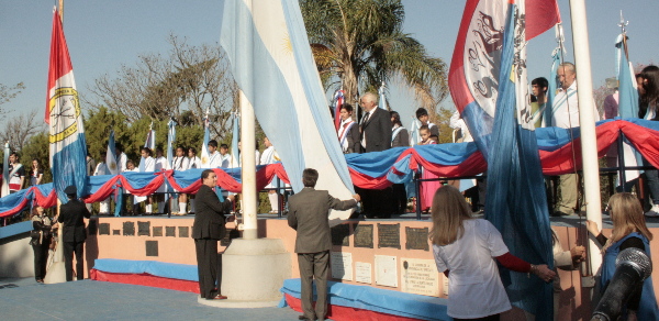 Abanderado de Las Toscas dieron el colorido para el inicio de dicho acto. Seguidamente, el intendente, Leandro Chamorro con otras autoridades izaron las banderas de la nación, la provincia y la distrital, juntamente con el Senador suplente, Gustavo Steeman, la Presidenta del HCM, María Isabel Benítez, Comisario Principal, Ariel Perez, y las escuelas N°847, Jardín de Infantes N°127 y Escuela de Enseñanza Media para Adultos N°1289, para luego entonar las estrofas del himno nacional argentino con los acordes de la Banda de Música Militar de la Base de Apoyo Logístico de la ciudad de Resistencia, del Ejército Argentino.