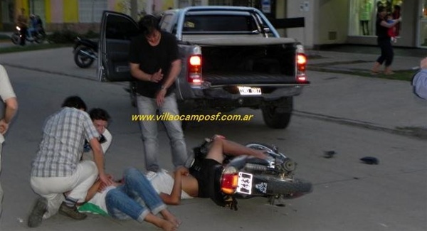VILLA OCAMPO – Accidente que involucró a una moto y una camioneta 4×4. Sucedió este domingo a las 18,40 horas aproximadamente.Por Boulevard Sarmiento al 1.120, en dirección norte sur circulaban en una moto Zanella ZB color negra 110 c.c. dominio GZJ 792 conducida por MIGUEL ANGEL GONZALEZ (28) y como acompañante ANTONIO OVIEDO (16) y a unos 20 metros antes de llegar a la intersección del citado Boulevard con calle Caseros, embistieron a la camioneta Toyota Hilux 4×4 Intercooler color gris, dominio IMO 087 conducida por el Médico SEBASTIÁN ALONSO quién aparentemente maniobraba marcha atrás desde el estacionamiento frente a su domicilio.