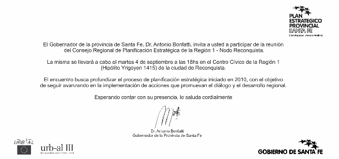 La invitacion del Sr Gobernador, Dr Antonio Bonfatti, a la primera reunión del año del Consejo Regional de Planificacion Estrategica de la Region 1, para este martes 4 de setiembre de 2012 a las 18 hs en el Centro Civico de la Region 1 Nodo Rqta, la cual tiene como objetivo :