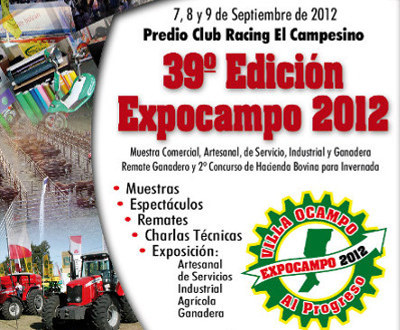 EXPOCAMPO 2012 – Se organiza una nueva edición de la Expocampo 2012, que tendrá lugar los días 7, 8 y 9 de Septiembre en el predio del Club Racing “El Campesino”.La organización, por quinto año consecutivo está a cargo de la Asociación Bomberos Voluntarios, el Club de Caza y Pesca “El Irupé” y la Municipalidad de Villa Ocampo.