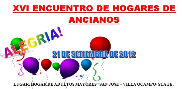 VILLA OCAMPO – Este 21 de setiembre, se realizará el XVI Encuentro de Hogares de Ancianos, en el Hogar de Adultos Mayores «San José», para festejar el dia de la primavera, el dia del jubilado y el dia internacional de las personas de edad.El Hogar de Adultos Mayores «San José», invita al XVI Encuentro de Hogares de Ancianos para este 21 de setiembre, fecha en que se conmemora el día de la primavera; día del jubilado y además, el día internacional de las personas de edad.