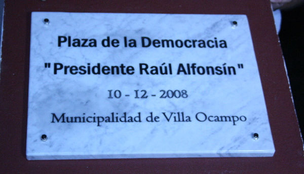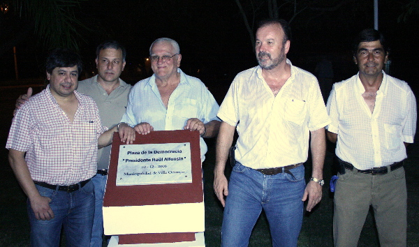 A continuación, el intendente y vecinos descubrieron la placa en homenaje al ex presidente Raúl Alfonsín, la que quedará en forma definitiva en esta plaza, cuyo nombre pasará a llamarse a partir de ahora, plaza de la democracia «Presidente Raúl Alfonsín».