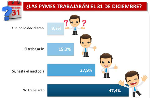 NACIONALES – Más de 900 dueños y directivos de pymes de Argentina, respondieron a la consulta. ¿Usted ya decidió si su personal trabajará el 31 de diciembre?.El 47.4 % de los directivos, respondieron que no trabajarán. El argumento más frecuente entre los empresarios apuntó a que tomarán esta fecha “como un feriado puente” similar al del 24 de diciembre.