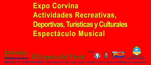 Turismo XII Fiesta de la Corvina 15 enero, 2013 Compartir en Facebook Compartir en Twitter tweet FORMOSA – El Ministro de Turismo de Formosa invita a la XII Fiesta de la Corvina, a llevarse a cabo los días 8 al 10 de febrero de 2013, en La Herradura, a 40 km al sur de la capital formoseña.
