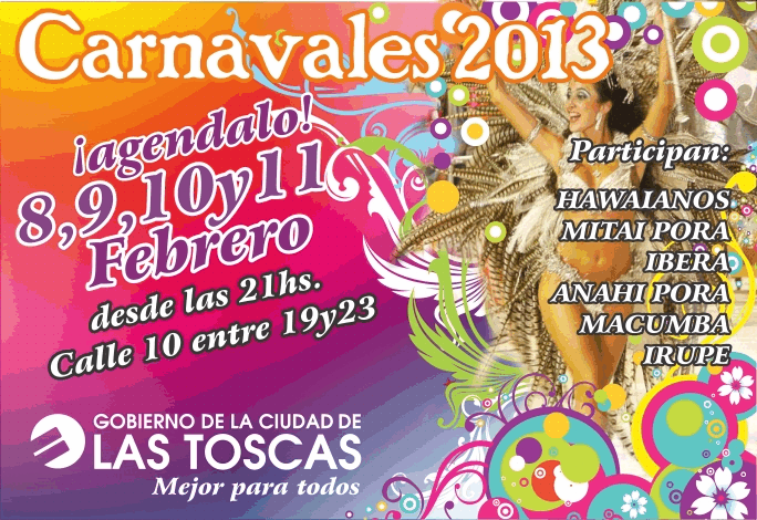 LAS TOSCAS – La Dirección de Cultura de la ciudad de Las Toscas, invita a los corsos 2013, en calle 10 entre 19 y 23, para los los días viernes 8, sabado 9, domingo 10 y lunes 11 de febrero.Dicho evento se llevará a cabo los días viernes 8, sabado 9, domingo 10 y lunes 11 de febrero; en la arteria de calle 10 entre 19 y 23; a partir de las 21 horas.