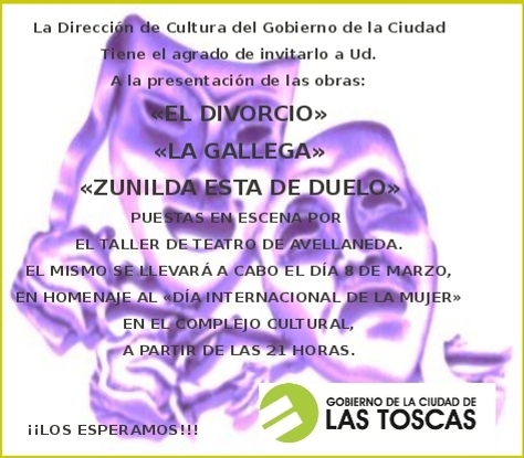 las obras a presentarse son interpretadas por integrantes de la escuela de teatro de la ciudad de Avellaneda; «El Divorcio» con Fany Zupel y Germán Galarza. «La Gallega» con Beba Terzaghi y Mariana Gomez Sandrigo. Y «La Zunilda está de duelo» con Germán Galarza y Ana Rosa Paduan. Direccion : Mariana Gomez Sandrigo; Iluminacion y Sonido. Oliden Magnago. Las tres obras son de genero comedia (muy divertidas).