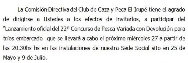 Lanzamiento del Concurso de pesca variada adminypunto hace 13 años VILLA OCAMPO – CLUB DE CAZA Y PESCA «EL IRUPE» –